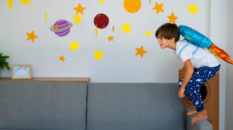 Birourile pliabile, panourile de scris montate pe perete sau mesele compacte extensibile oferă un spațiu de lucru complet fără a ocupa permanent mult loc. Pentru zona de joacă, alege covoare antiderapante și ușor de curățat, care delimitează clar spațiul și îl fac sigur.